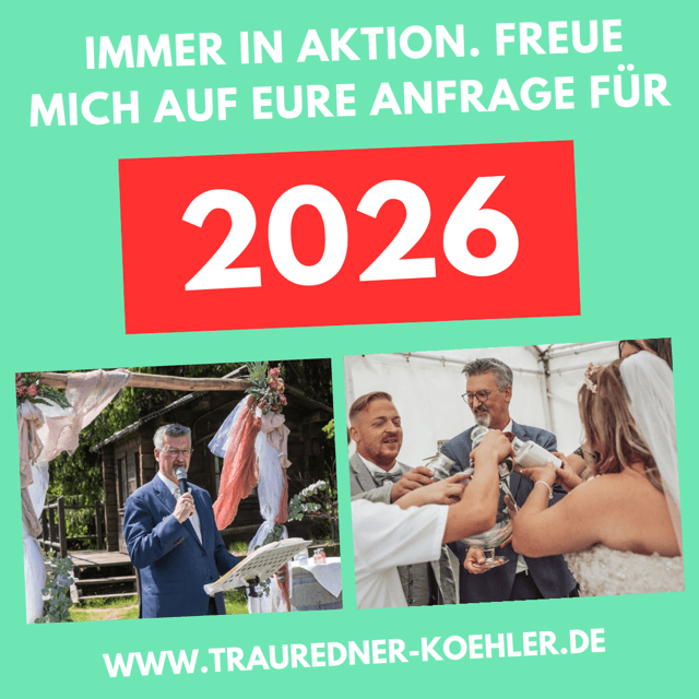 Ihr könnt euch sicher sein: Es ist mir eine große Freude und Ehre zugleich, der Trauredner und Hochzeitsredner für euch sein zu dürfen. Ihr habt noch Fragen? Meldet Euch gerne bei mir. Ich bin für Euch da. >> Checkt jetzt euren Termin mit mir 🙂 <<