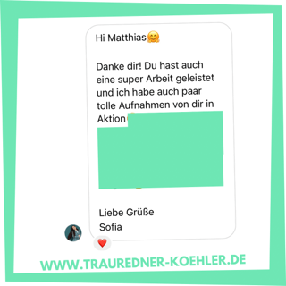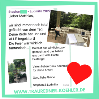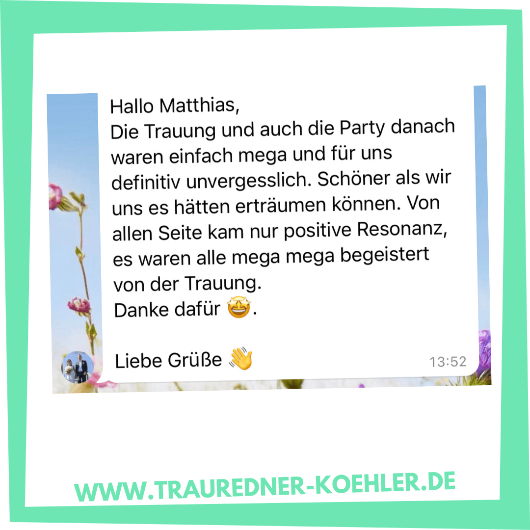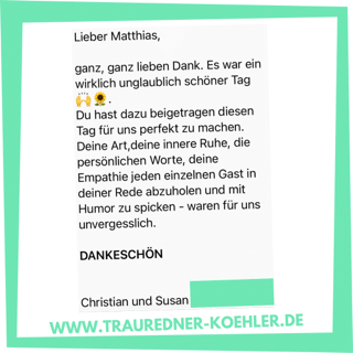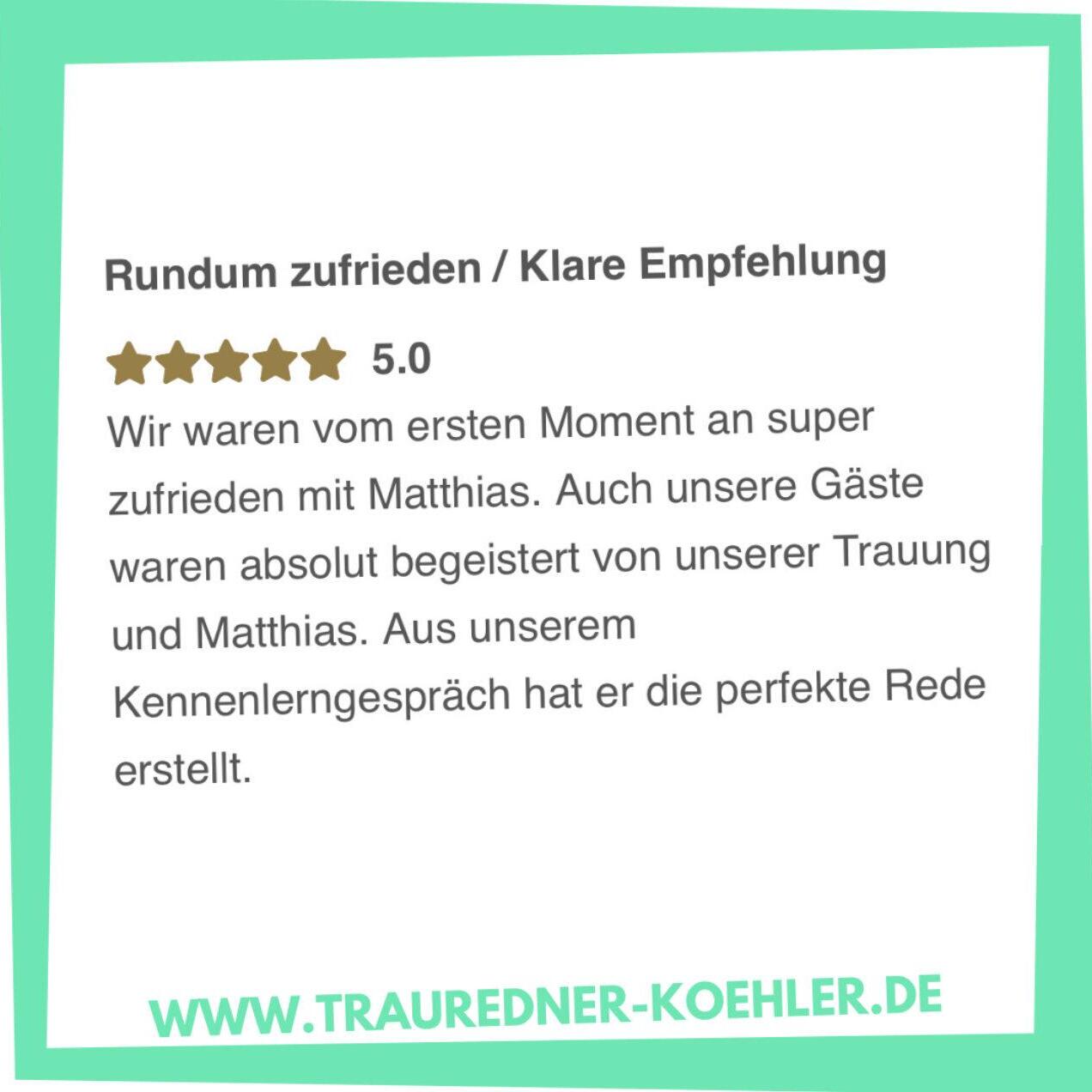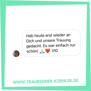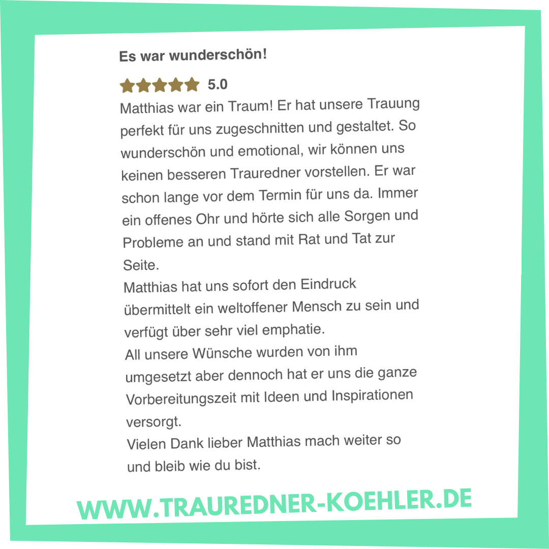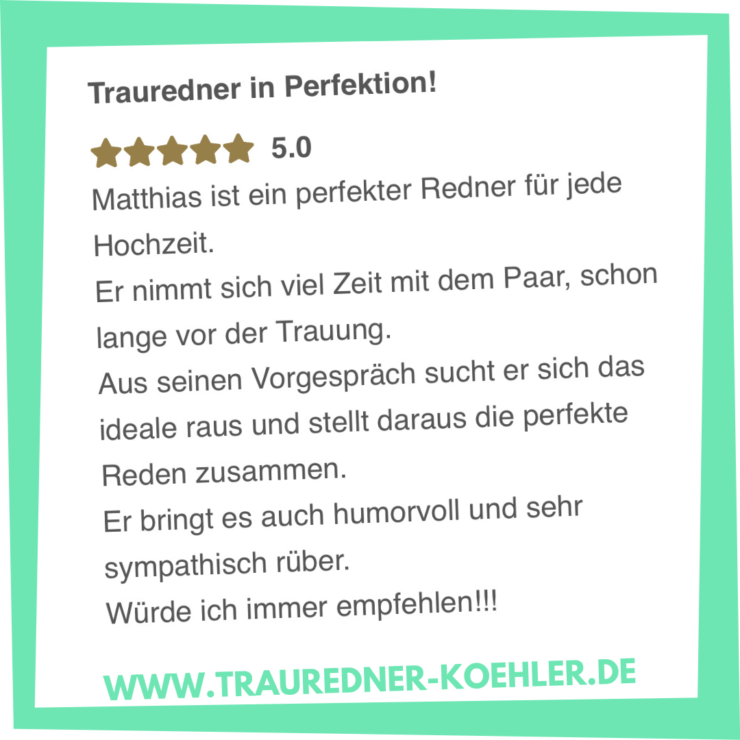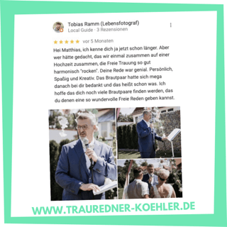 Wir haben nach der Trauung noch über Wochen vielfach Komplimente zu unserer Zeremonie bekommen und können Matthias von ganzem Herzen als Trauredner empfehlen.