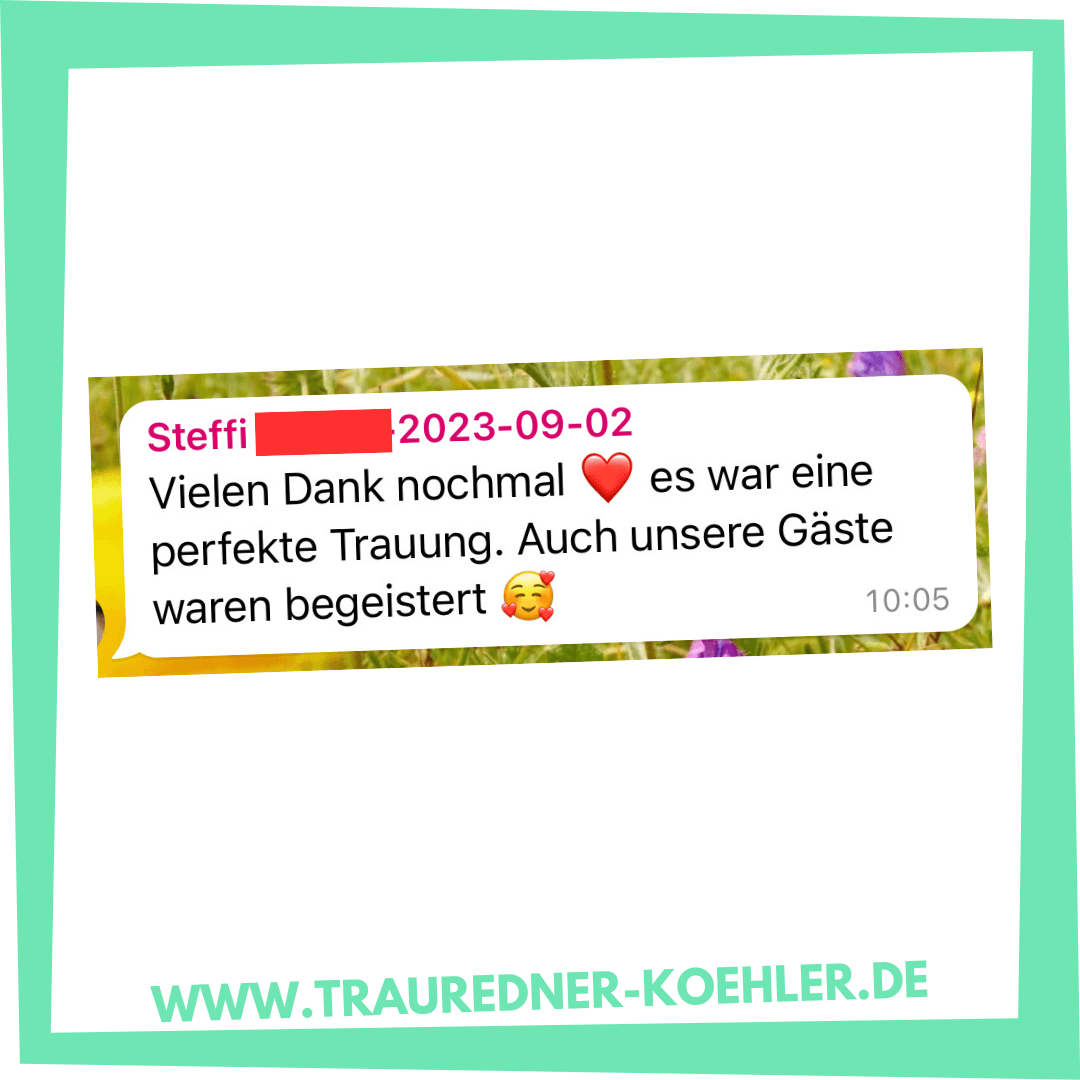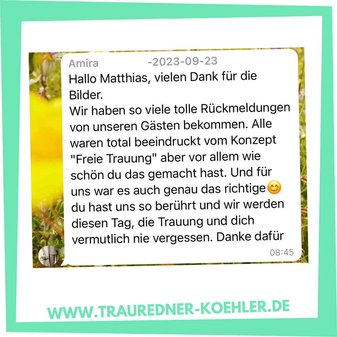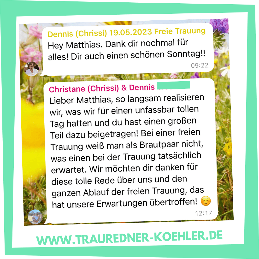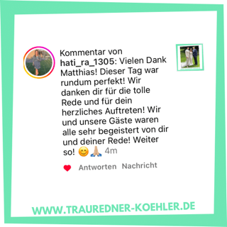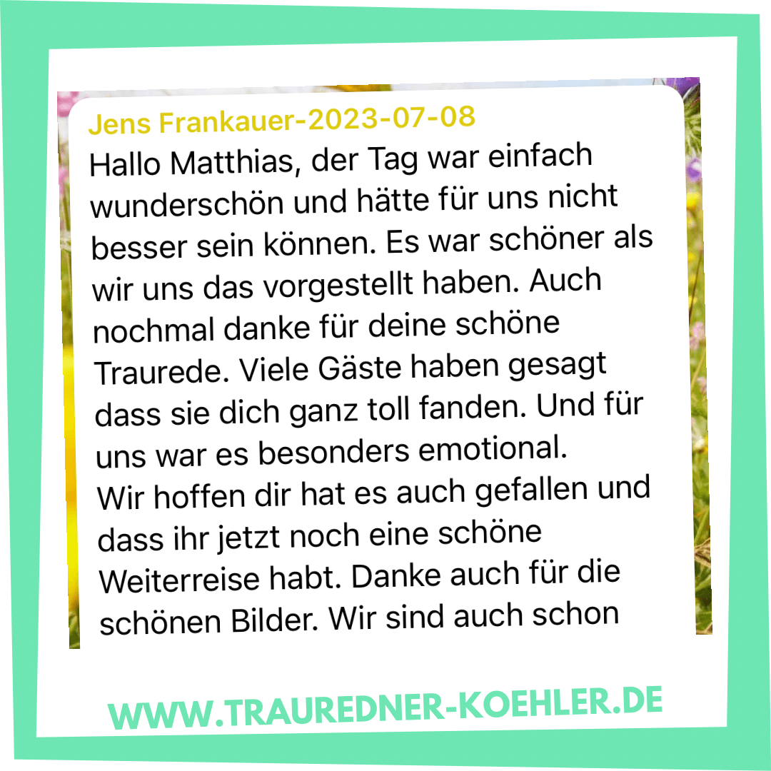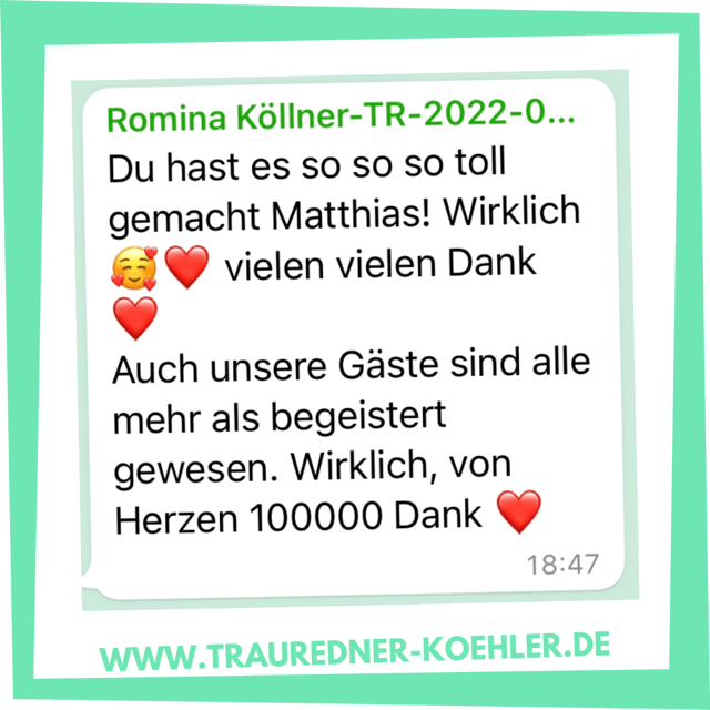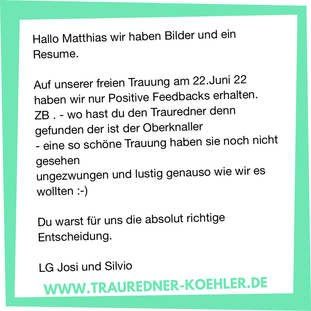 Wir haben nach der Trauung noch über Wochen vielfach Komplimente zu unserer Zeremonie bekommen und können Matthias von ganzem Herzen als Trauredner empfehlen.