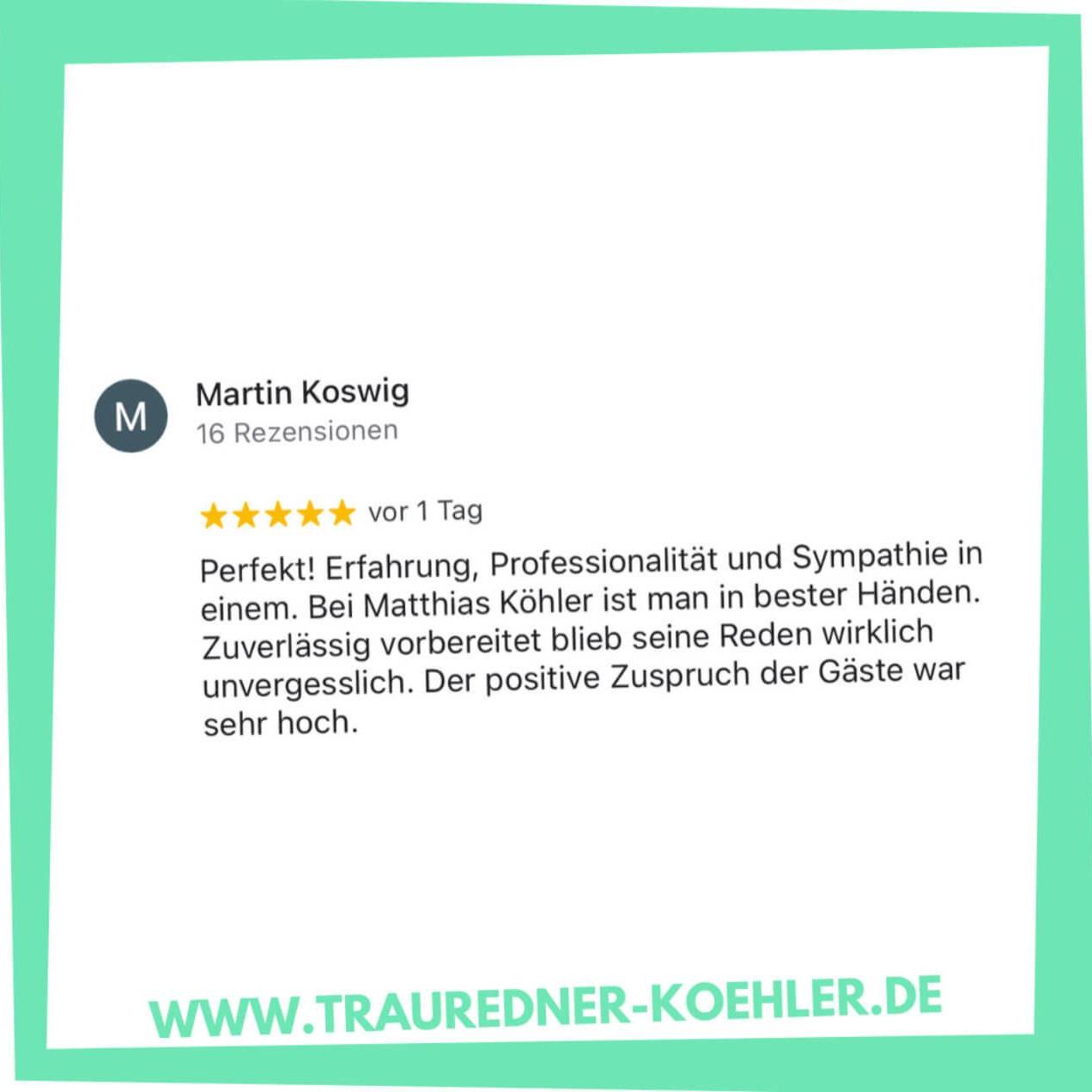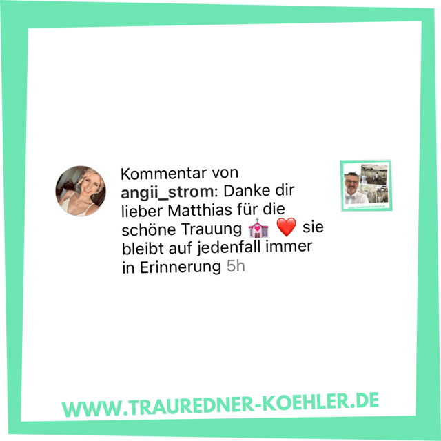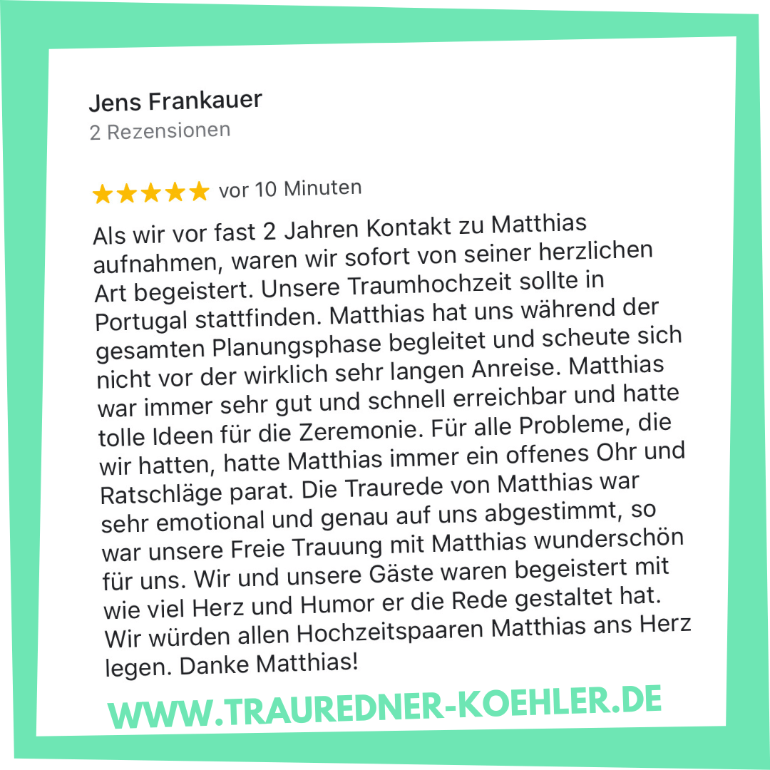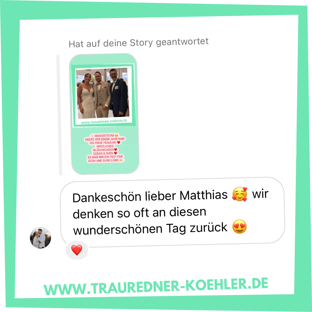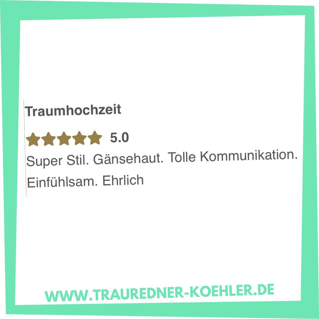 Wir haben nach der Trauung noch über Wochen vielfach Komplimente zu unserer Zeremonie bekommen und können Matthias von ganzem Herzen als Trauredner empfehlen.
