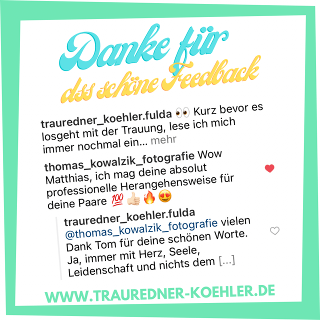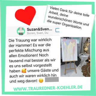 Zum Lesen der Stimmen bitte einfach DIREKT AUF DIE FOTOS KLICKEN! Hier ein kleiner Auszug verschiedener Brautpaar-Stimmen und Kollegen:innen-Stimmen.