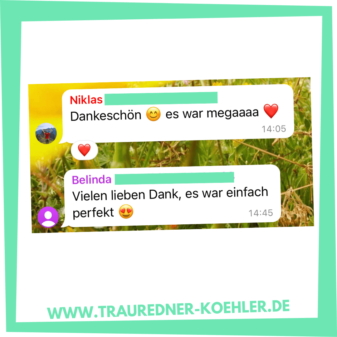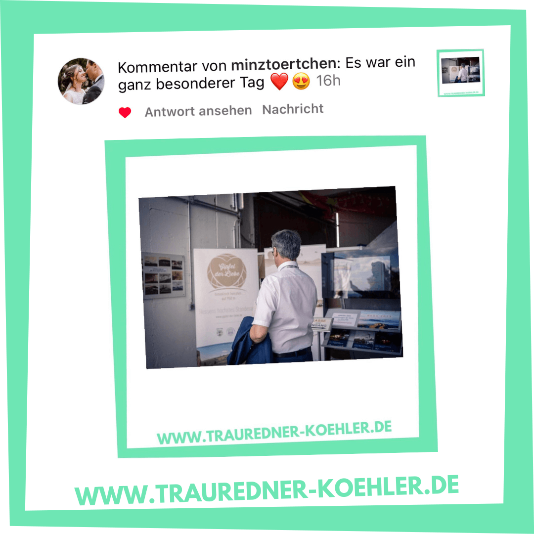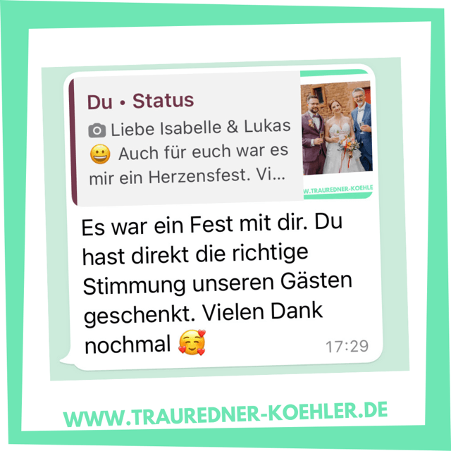 Gefreut habe ich mich auch von den Stimmen der Hochzeitsgäste. Es ist einfach toll, wenn man nach der Trauung gesagt bekommt, „Du bist der beste Trauredner den ich bisher bei einer Freien Trauung gehört habe“. Das motiviert mich immer wieder noch mehr für „mein“ Brautpaar in der Freien Trauung zu geben.