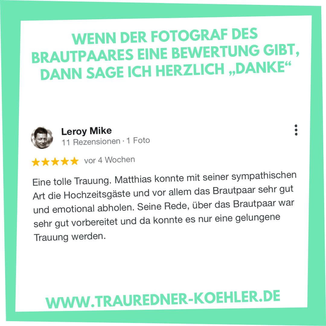 Ich habe Matthias als überaus sympathischen und professionellen Hochzeitsredner kennengelernt und ich persönlich als Hochzeitsfotograf habe die Zusammenarbeit mit ihm sehr genossen.