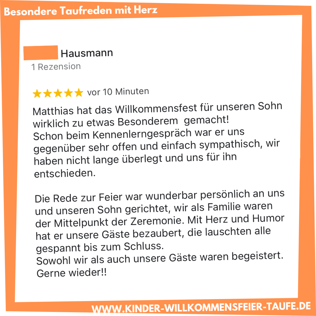 Ich freue mich jetzt schon mit Euch, für Euren Nachwuchs als Willkommensfeierredner und Taufredner einen ganz besonderen Tag zu gestalten. Ganz nach dem Motto: „Hallo Welt…ich bin da…lasst uns das so richtig feiern!“ Herzlichst Euer Matthias und herzlichen Dank für Eure Anfrage.